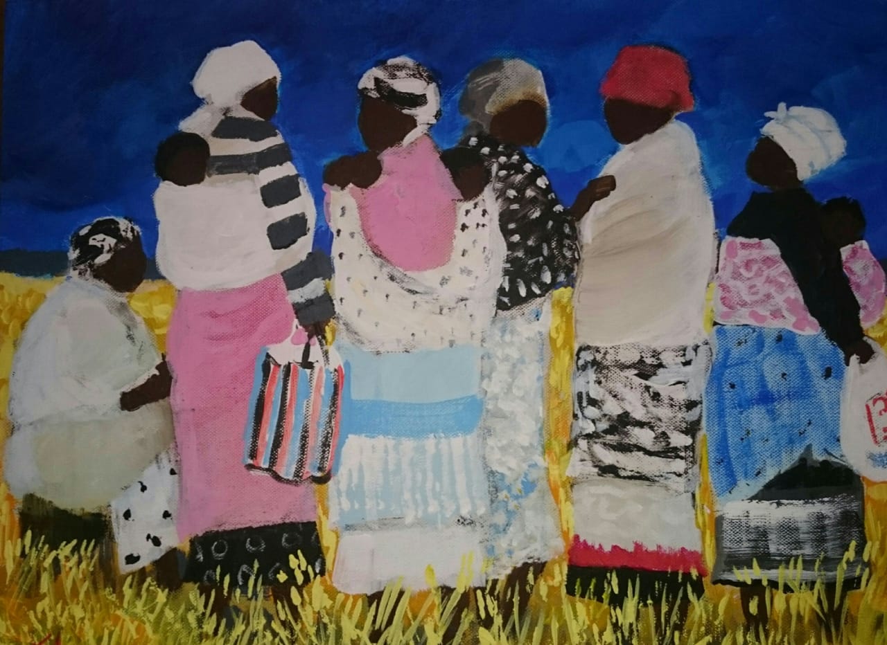 In this scene, the different fabrics of the African women’s clothes, baby blankets and shopping bags form a colourful patchwork quilt in the foreground against a brilliant blue South African sky and characteristic long yellow grass. As happens all over the world, women gather to swap stories and connect: How many teeth does your baby have? Is she crawling yet? There is a special on cooking oil at Pick ‘n’ Pay. I had a tough day at work…